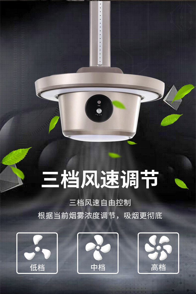 吸力大,聲音小,重量輕。360°環(huán)吸設(shè)計(jì),節(jié)省管道耗材。可在室內(nèi)制造空氣循環(huán),全方位凈化空氣吸煙攏煙效果卓越。